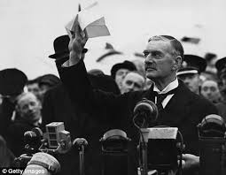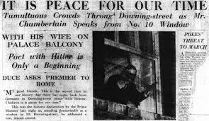 "The settlement of the Czechoslovakian problem, which has now been achieved is, in my view, only the prelude to a larger settlement in which all Europe may find peace. This morning I had another talk with the German Chancellor, Herr Hitler, and here is the paper which bears his name upon it as well as mine. Some of you, perhaps, have already heard what it contains but I would just like to read it to you: ' ... We regard the agreement signed last night and the Anglo-German Naval Agreement as symbolic of the desire of our two peoples never to go to war with one another again.'
